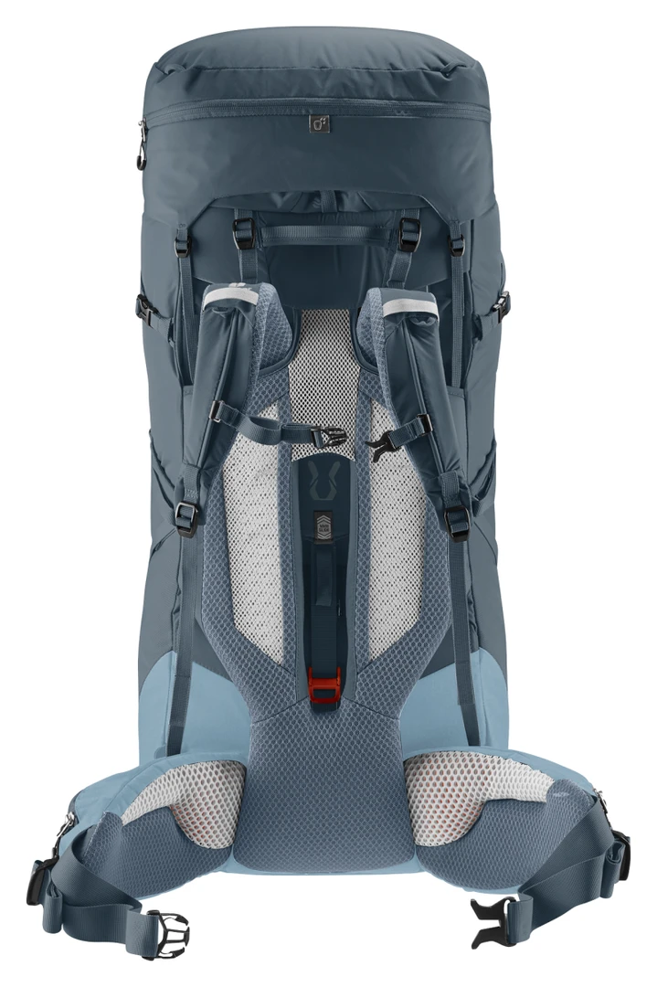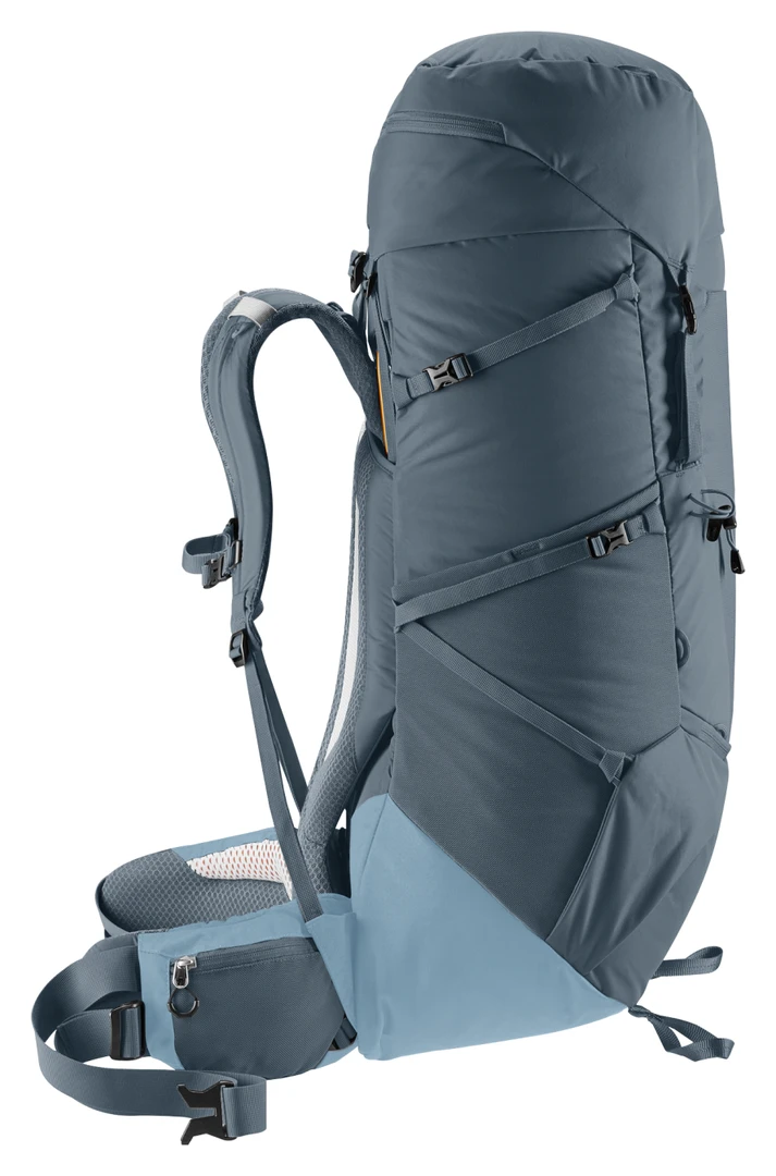 Its superior carry comfort is down to the Deuter Aircontact back system with Air Spacer mesh and a large ventilation channel, plus ergonomic ActiveFit shoulder straps and an adjustable sternum strap. The Y-shaped frame, mobile hip fins and ergonomic lumbar pad combine to distribute the load effectively. A full-length, J-shaped zipper on the front makes contents easy to locate lower down in the main compartment. Hip fin pockets provide easy storage and keep items within reach. Stretch mesh side pockets keep bottles close at hand for hot days on the trail.
