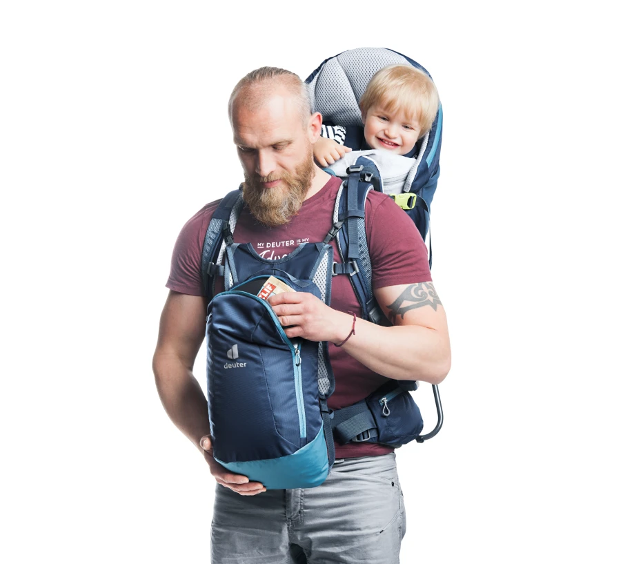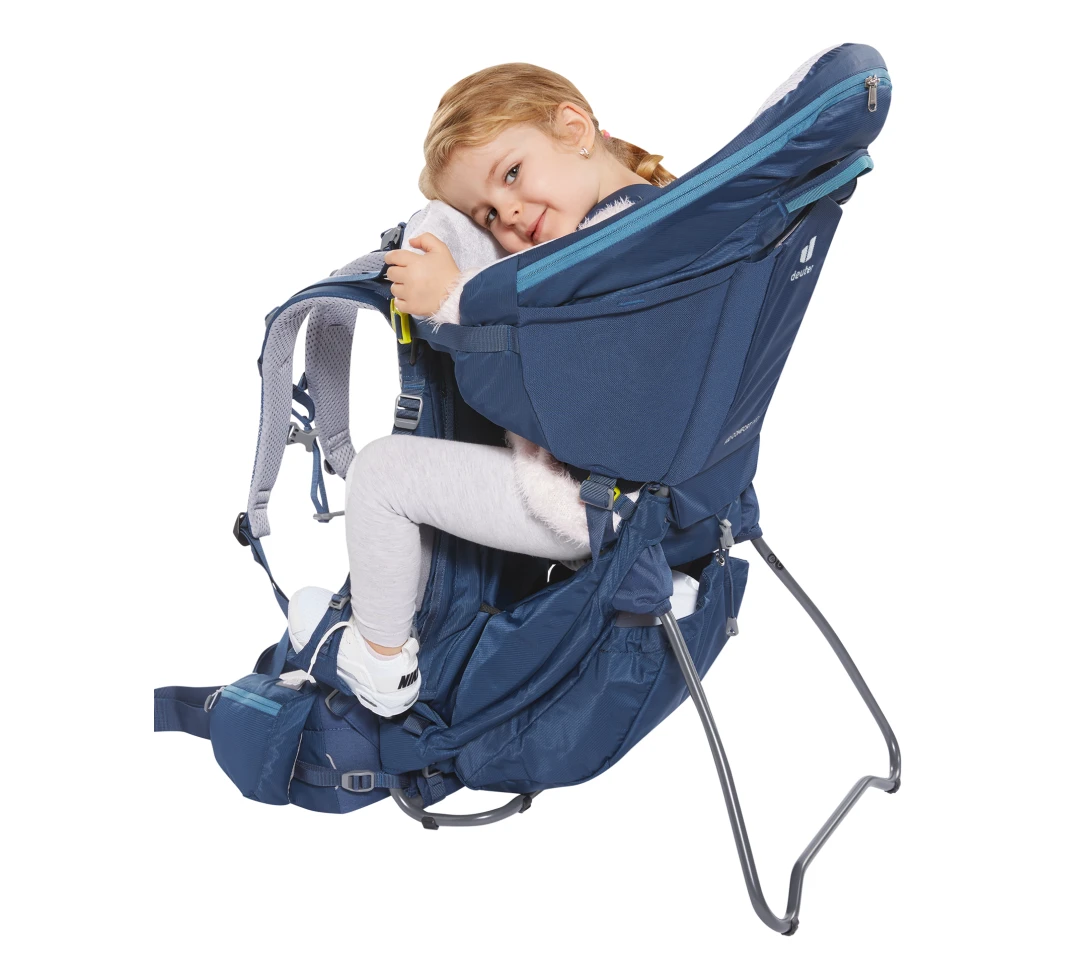 The pro child carrier comes with an integrated, separately useable daypack for quick runs to the changing room. There is also a fixed sun roof and a mirror for a quick rear-view of the child on the back. The load is transferred perfectly, thanks to the new Aircomfort Sensic Vario mesh back system. The child carrier fits snuggly while the back is fully ventilated. The large, soft pillow gently braces the tired childβs head even in the corners and supports a relaxing nap. The side entry and the easy-to-use harness system ensure safety, guaranteed by the TΓV GS safety seal of approval.