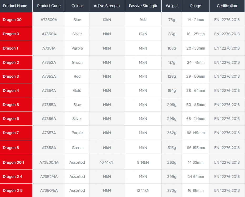 Single stem, dual axle design gives Dragon cams 360° flexibility and a substantial expansion range, increasing performance in sub-optimal placements and helping you get the right piece first time. The Dragon cams hot-forged thumb press gives stable handling and reduces fumbling from gloved hands and pumped fingers. It allows the Dragon to have an extendable sling with no strength penalty, reducing the number of quickdraws needed to extend placements and minimizing rack weight.