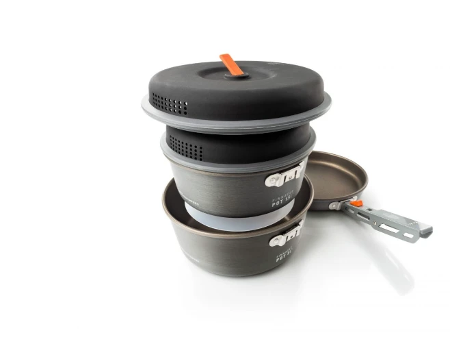 These durable, non-stick coated, hard anodized aluminum pots are the ultimate in design, space efficiency and cooking performance. Every set includes a 2 pots, a frypan, 2 nylon strainer lids, a cutting board for a variety of prep duties, a folding pot handle, and a welded stuff sack to keep everything organized and doubles as a sink for washing.