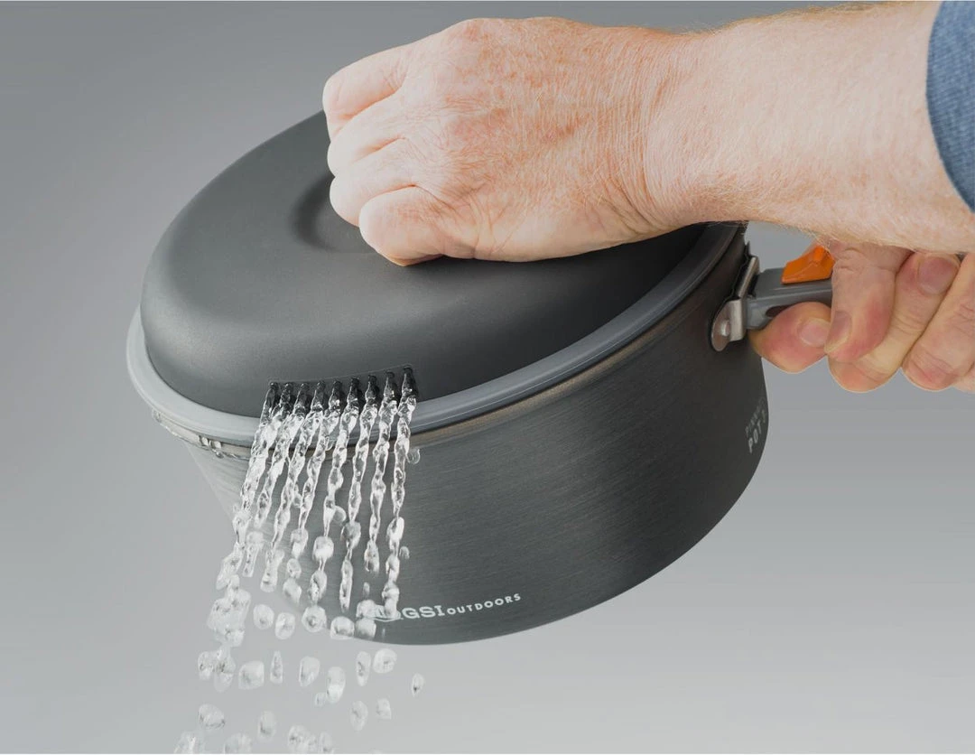 So efficient, so durable, so technically advanced, so colorful – this is the Pinnacle of campsite cooking. And eating, too. Garnet hard, the anodized aluminum pots and frypan are scratch proof and deliver efficient, even heating. Then GSI added Teflon® with Radiance Technology for amazing non-stick performance, easy cleaning, and amazing heat transfer that reaches temperature 25% faster than other coatings. When it’s time to eat, you’ve got four 14oz mugs with insulated sleeves and sip through lids, four 14oz bowls, and four plates – all color coded so there’s no mix ups. There’s also a pot gripper and our strainer lid for easy draining. And – of course – it all nests together perfectly into the storage bag that doubles as a camp sink.