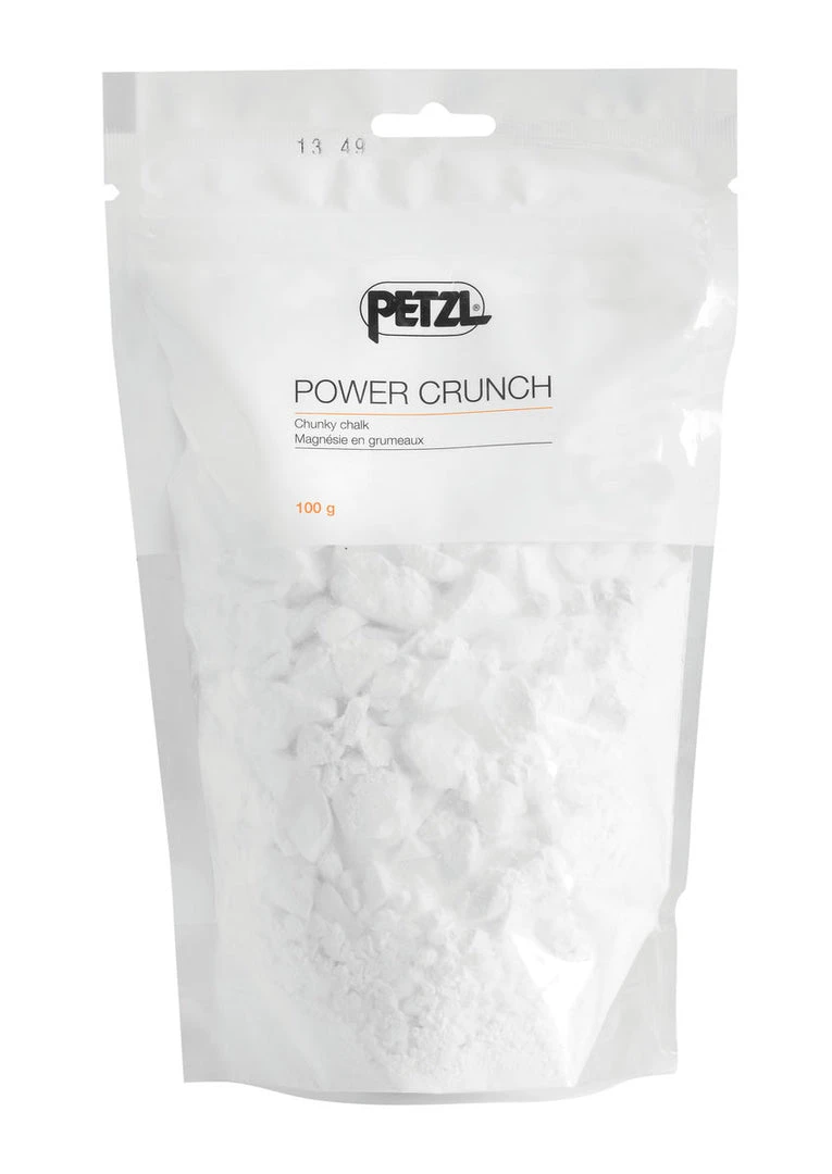 Power crunch chunky chalk improves grip when climbing. It is available in two sizes of packets to suit the climber’s needs: the 100 g packet fills one chalkbag and leaves a little extra, the 200 g packet can be stored for refills.